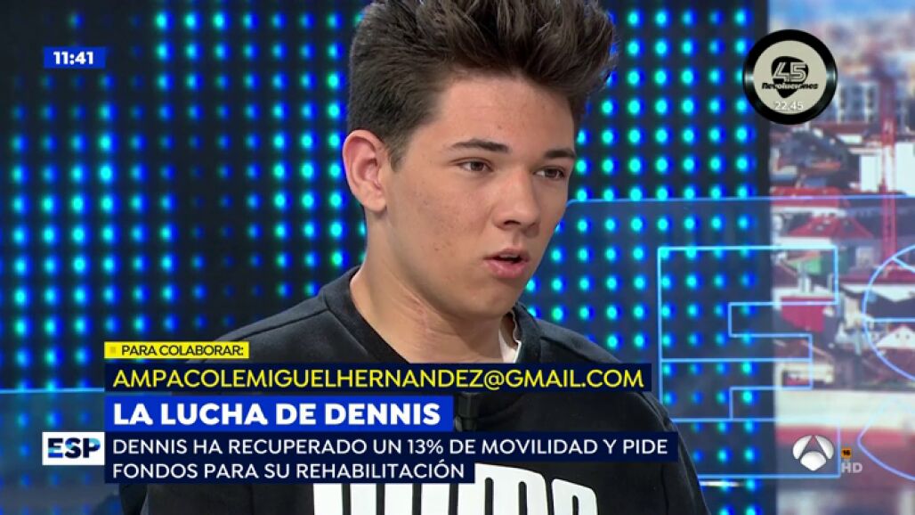 Dennis y su familia han visitado el plató de 'Espejo Público' para pedir ayuda para el joven. Dennis sufrió un trágico accidente en el peligroso salto del Lobo, en Alicante. Quedó tetrapléjico, pero no se ha rendido. Lucha cada día por recuperar la movilidad con una valentía ejemplar.