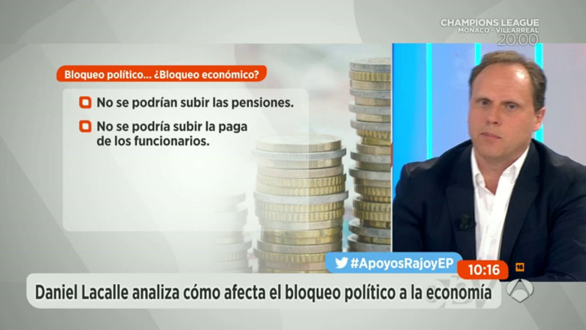 Daniel Lacalle asegura en Espejo Público que la ausencia de Gobierno puede provocar, como primera consecuencia que, al tener que prorrogar los Presupuestos Generales del Estado "no se podrían subir las pensiones, ni la paga de los funcionarios y habría menos dinero para las Comunidades Autónomas", entre otras cosas.
