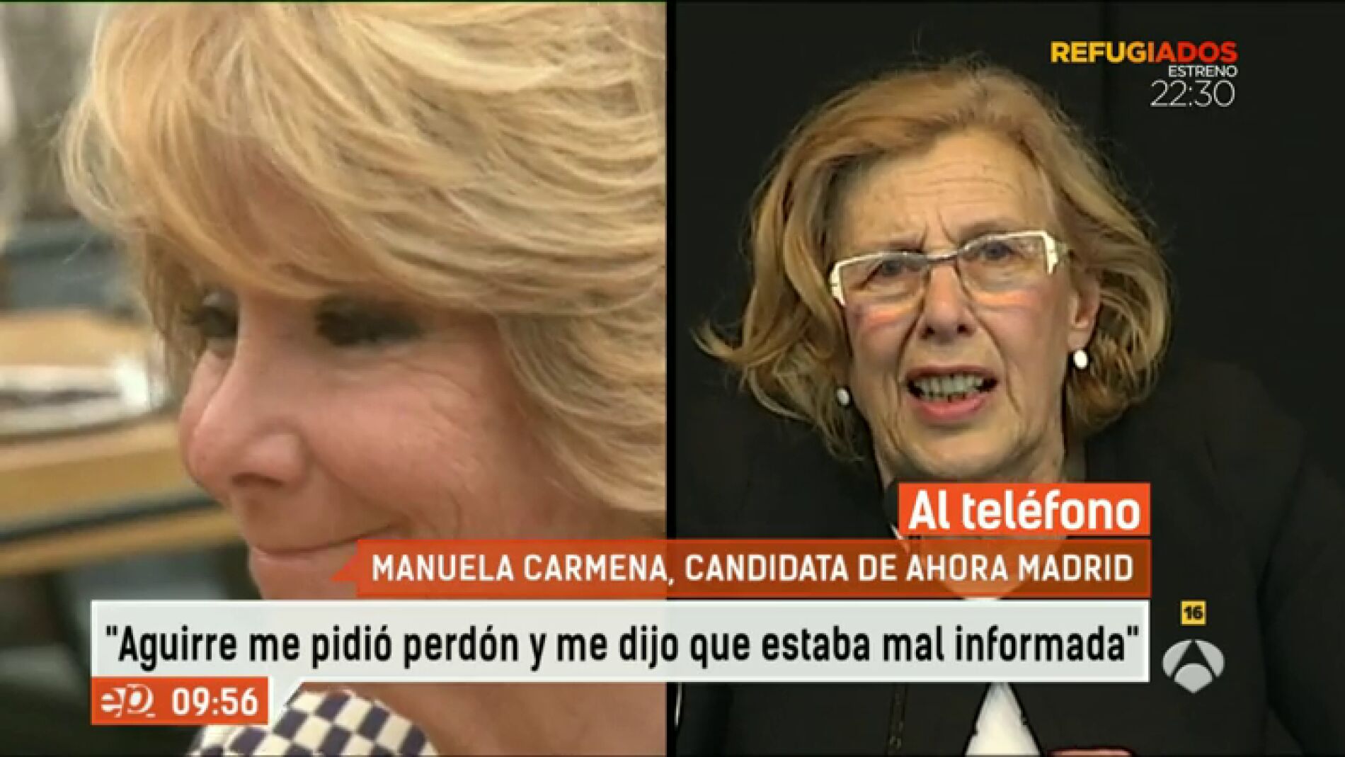 Manuela Carmena, candidata de Ahora Madrid a la alcaldía de la capital de España, ha hablado con Espejo Público tras las recientes declaraciones de Esperanza Aguirre que la acusó de no ser jueza. Unas afirmaciones que la candidata del PP ha tenido que desmentir al no ser ciertas. "Me sorprendió lo que había dicho y cuando la llamé me pidió perdón pues me dijo que estaba mal informada, ya que había recurrido a una noticia del año 1996", asegura Carmena. "Le contesté que procurara informarse mejor y que hiciera una carta de rectificación, que no me ha llegado, pero parece que ya ha rectificado".