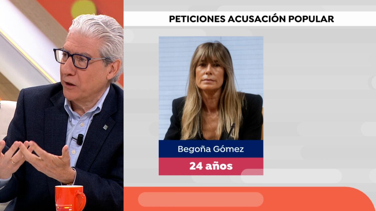 Casimiro García- Abadillo, director de 'elindependiente.com', ha analizado en Espejo Público la petición de 24 años de cárcel para Begoña Gómez por parte de la acusación popular. En el escrito, la dirección técnica de 'Hazte Oír', solicita 24 años de prisión para Begoña Gómez por tráfico de influencias, corrupción en los negocios, malversación y apropiación indebida. También reclaman 22 años de cárcel para su asistente, Cristina Álvarez y seis para el empresario Juan Carlos Barrabés.