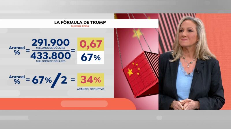 "Lo que hace al dividirlo por dos es como dividir la brecha diciendo: vamos a intentar amortiguarlo para que sea sostenible, -apunta Cristina Peña-, pero luego esto lo suma al 20 por ciento que ya estaba aplicando anteriormente a China", De ahí sale el 54 por ciento de aranceles que deberá pagar China a partir de ahora por exportar a Estados Unidos. Una fórmula de la que todos los expertos destacan su falta de rigor. Puro Trump.