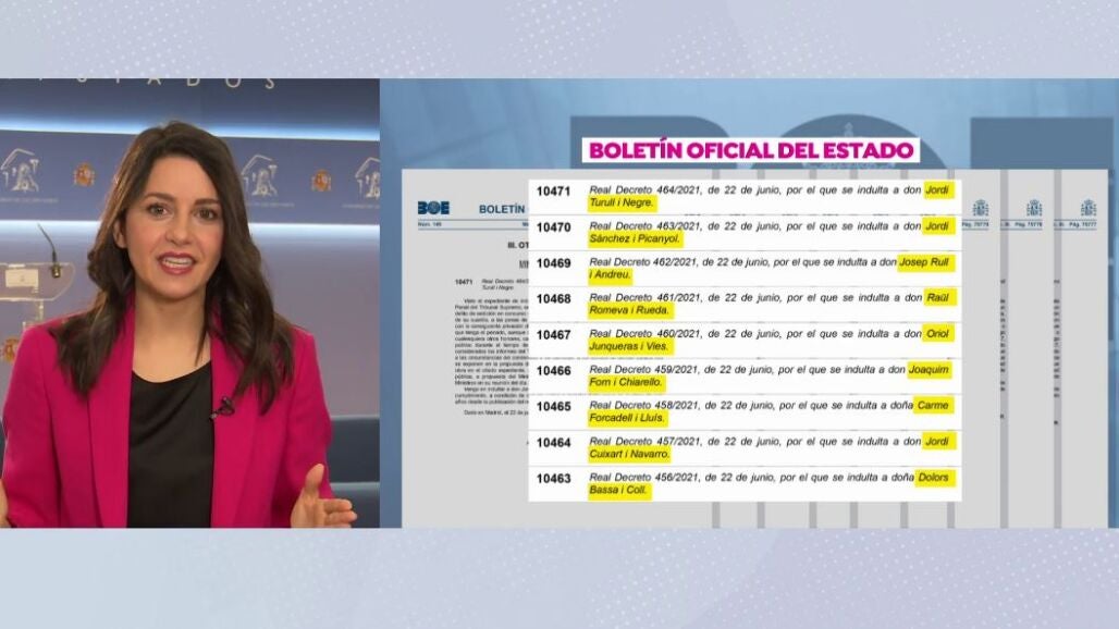 Inés Arrimadas, líder de Ciudadanos, asegura que su partido recurrirá los indultos. Mantiene que estaban en el Parlamento cuando se dio el golpe de Estado y no se les dejó intervenir, por lo que fueron en amparo al Tribunal Constitucional. Se define como "parte perjudicada como representantes públicos de la ciudadanía de Cataluña que fueron anulados en sus funciones".