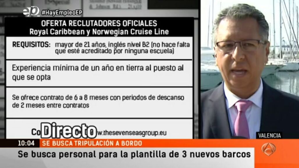 Dos importantes navieras ofrecen 500 puestos de trabajo para cubrir puestos en tres cruceros que surcarán los mares este verano. Se ofrece un contrato de 6 y 8 meses con periodos de descanso de 2 meses entre contratos. Los requisitos son ser meyor de 21 años, un aceptable nivel de inglés y una experiencia mínima de un año en tierra al puesto al que se opta. Más información en www.thesevenseasgroup.eu