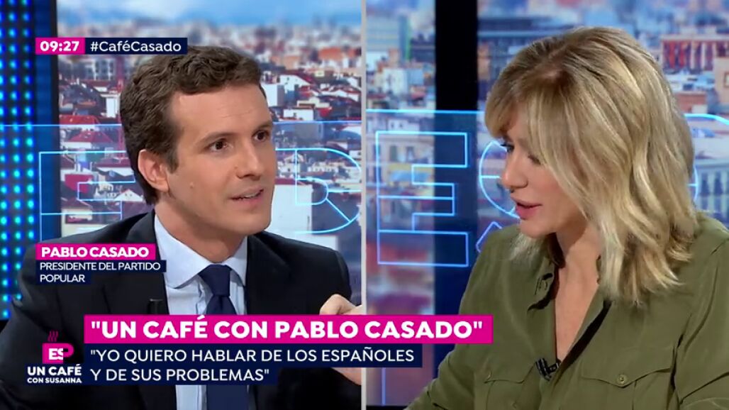 El líder del Partido Popular, Pablo Casado, ataca a Vox por su invisibilidad en los medios, "Vox habla de llevar armas por la calle y Pedro Sánchez habla de Franco.Yo quiero hablar de empleo y de pensiones". Casado, insiste en el voto últil de las próximas Elecciones Generales del 28 de abril. "Es una cuestión de responsabilidad" dice Casado en un 'Café con Susanna'.