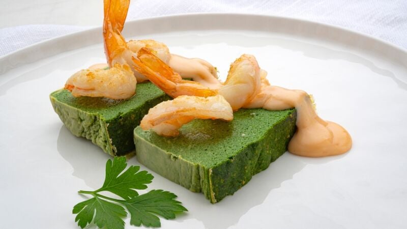 Desmolda el pastel con ayuda del papel de hornear. Sirve dos porciones por persona y extiende una cucharada de bechamel sobre cada porción. Pon un langostino encima de cada trozo. Decora con unas hojas de perejil.