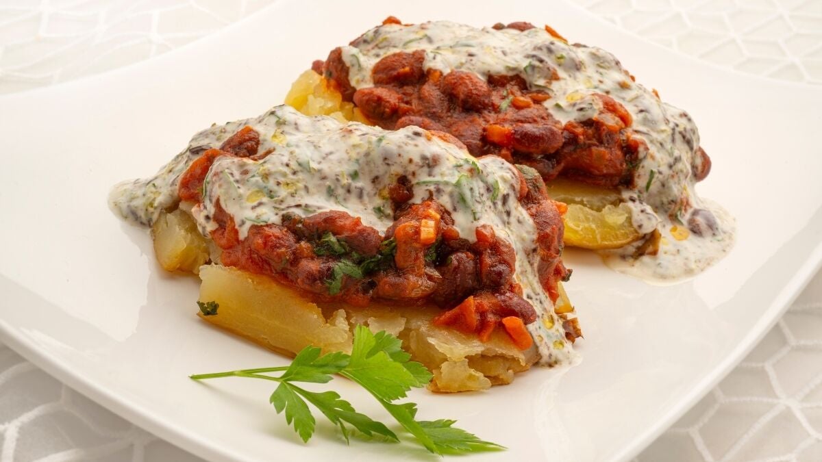 Saca las patatas del papel de aluminio, ábrelas por la mitad y aplástalas haciendo una especie de cama. Coloca encima el chili de alubias. Vierte por encima crema agria al gusto. Moja con un chorro de aceite de oliva y decora con una rama de perejil.