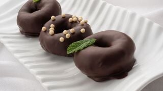 Cubre una bandeja de horno con film de cocina. Coloca encima una rejilla de horno y extiende las rosquillas. Nápalas con el chocolate y adorna la mitad con unas pepitas de chocolate blanco. Sirve y adorna con unas hojas de menta.