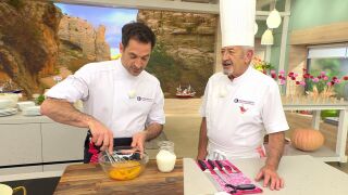 "Es la tarta que más me gusta del KA", afirma Arguiñano mientras su hijo prepara el pudin de espárragos verdes.