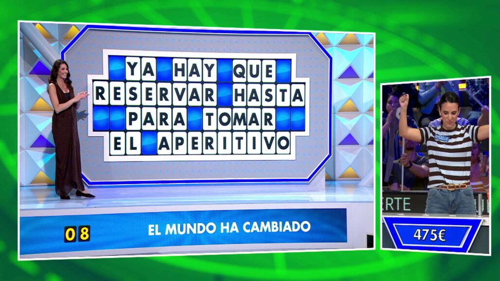 Finalmente, a falta de 25€ para llevarse la primera ola del programa, Amalia ha resuelto el panel a falta de ocho segundos para el final, por 475€, lo que le permite distanciarse de Ángela y acercarse a Óscar.
