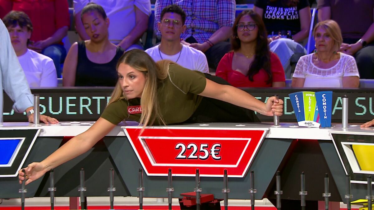 Carla, la concursante del atril rojo, posee la misma tirada al jugar en La ruleta de la suerte. La concursante ha caído continuamente en el gajo de 25 y por más que quería cambiar su jugada no podía.