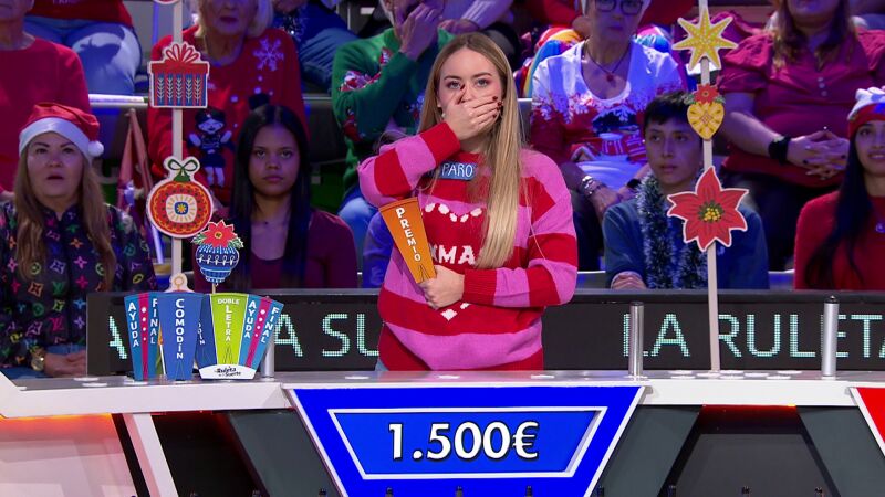 Este panel decía: “Se llena de aplausos: el concierto de villancicos de una fiesta escolar”. Y Amparo, la concursante del atril azul, lo ha resuelto. La concursante se caracteriza por su alegría contagiosa y ha vivido este momento con los nervios a flor de piel.