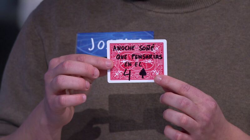 Josema ha demostrado a Jorge Fernández su habilidad con las cartas participando en un truco de magia. En este, el concursante del atril azul ha hecho elegir al presentador una carta de la baraja de póker; la carta escogida ha sido el cuatro de picas.
