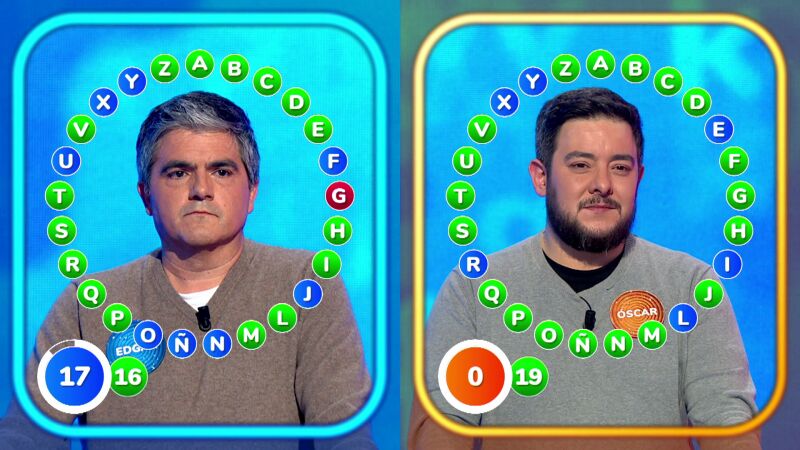 En este cara a cara se han visto detalles prometedores. Édgar ha comenzado con una ventaja de trece segundos y con un buen turno de cinco respuestas. En cambio, Óscar ha recurrido al Pasapalabra en la A, pero después ha ido cogiendo ritmo para ir por delante en el marcador.