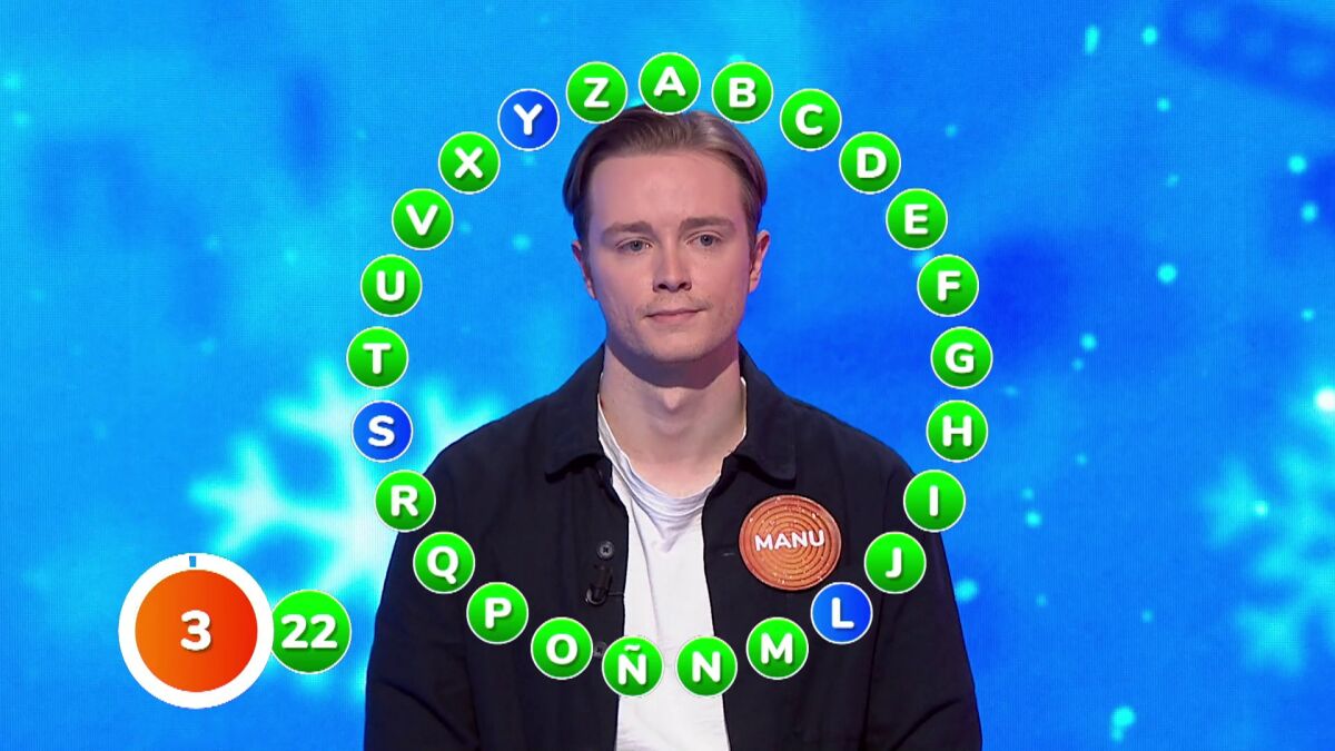 Con el mismo tiempo en ambos atriles, el arranque también ha sido idéntico: “Pasapalabra” en la A. Después, han comenzado las diferencias: un buen turno de nueve respuestas de Rosa, Manu también muy enchufado y con ritmo… La igualdad ha terminado plasmándose en un emocionante empate a 20 aciertos.