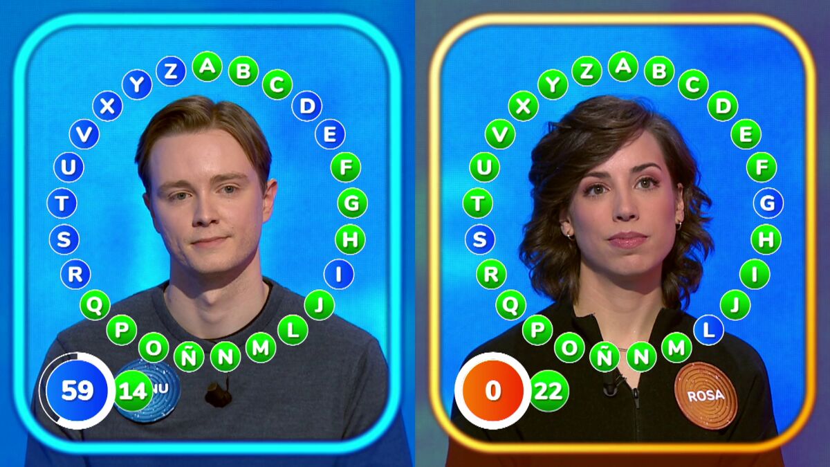 Que este Rosco haya sido rápido ha sido cosa de dos, a pesar de que ambos han llegado con bastante tiempo acumulado a la prueba. Sin embargo, es la táctica que se ha dado y el ritmo que se ha impuesto. Por el orden de las jugadas, teniendo en cuenta las buenas rachas de aciertos en uno y otro atril, ha sido Rosa quien primero ha terminado la primera vuelta. Lo ha hecho con 22 aciertos y lo ha dado por bueno, dejando pasar los 27 segundos que aún tenía.