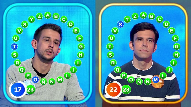 Los dos concursantes han arrancado El Rosco de forma tranquila, pero han tardado poco en acelerar. Javier, con cinco aciertos… ¡y David, con once! Por lo tanto, el barcelonés ha ido por delante en el marcador, hasta que su rival ha formado su propio jugadón de diez letras en verde.