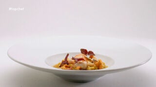 Añadirle un pelín de pimentón, el hígado de la anguila y la piel de la anguila, cortada en una brumoise muy pequeña para que dé gelatinosidad a ese arroz.