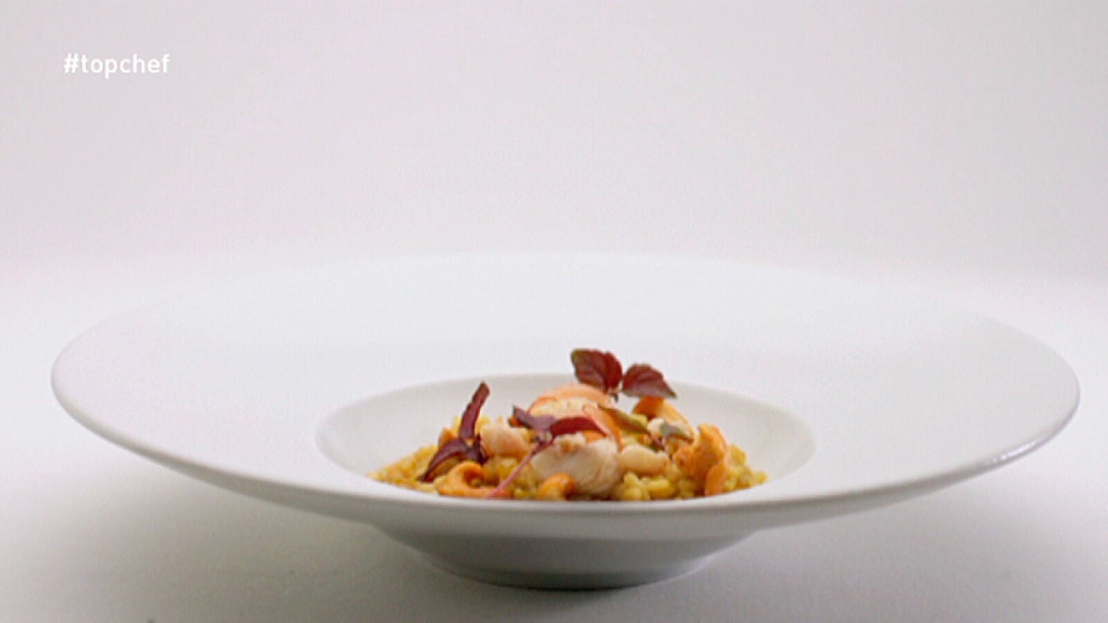 Añadirle lentamente el caldo al arroz y dejar cocinar hasta que esté en su punto, finalmente antes de servir ligar con una pizca de emulsión de tomates secos.