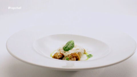 Poner los canelones en el fondo del plato, napar con la bechamel, colocar el queso parmesano por encima, y acabar el plato con un cordón de ajo y perejil y una hoja de espinaca fresca.