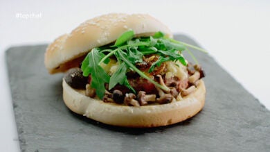 Poner encima la hamburguesa y, sobre ella, el queso de cabra.