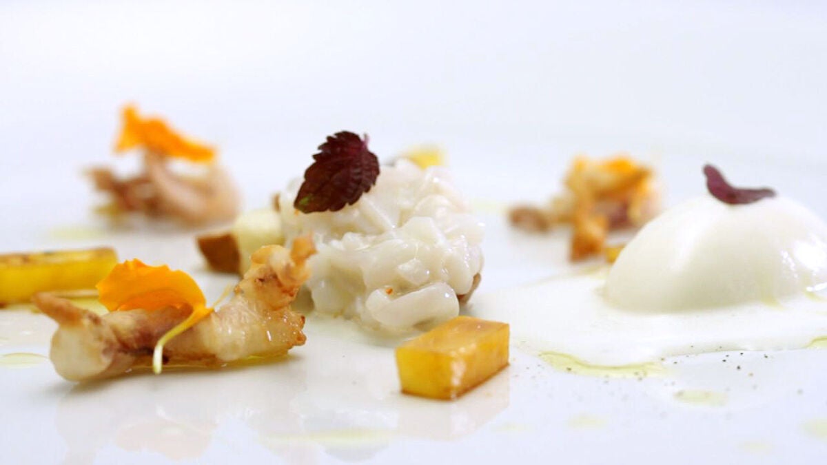 Antonio Arrabal realiza en la última prueba de fuego de est primera temporada de Top Chef un tartar de chipirón con cítrico, cebolleta confitada en soja y anís estrellado, melocotón caramelizado y helado de almendras.