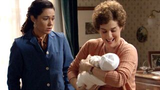 Benigna está que no entra en razón con la aparición del bebé, Moisés, anda que no se aguanta de la felicidad.