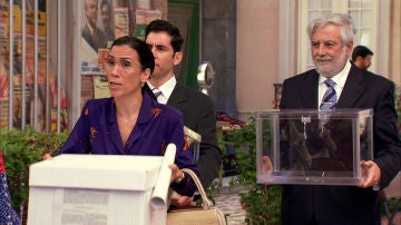 Manolita, dichosa, regresa a casa tras una dura jornada como presidenta de la mesa electoral. Pelayo y Marcelino la reciben como una gran heroína.