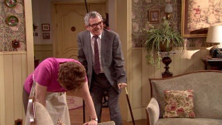 Iñaki Miramón en su papel de Justo Quintero entra en el hostal con buenas noticias para Benigna pero un resbalón de sus muletas hacen que Benigna (Anabel Alonso) no pueda contener las risas.