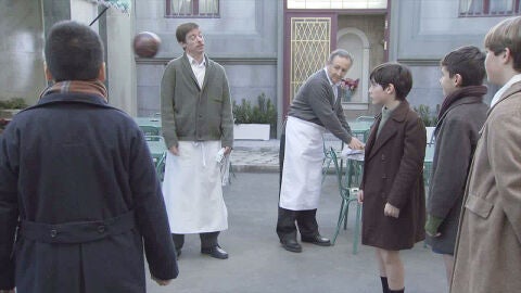 Durante los rodajes hay que repetir muchas veces las secuencias, pero más aún cuando en ellas debes contar con niños y un balón incontrolable... Marcelino y Pelayo se encuentran en la puerta del Asturiano cuando varios niños juegan de por medio con el balón. Marcelino no da a basto entre los balonazos que le dan en la cabeza, regañarles y la risa que le provoca tal escena.