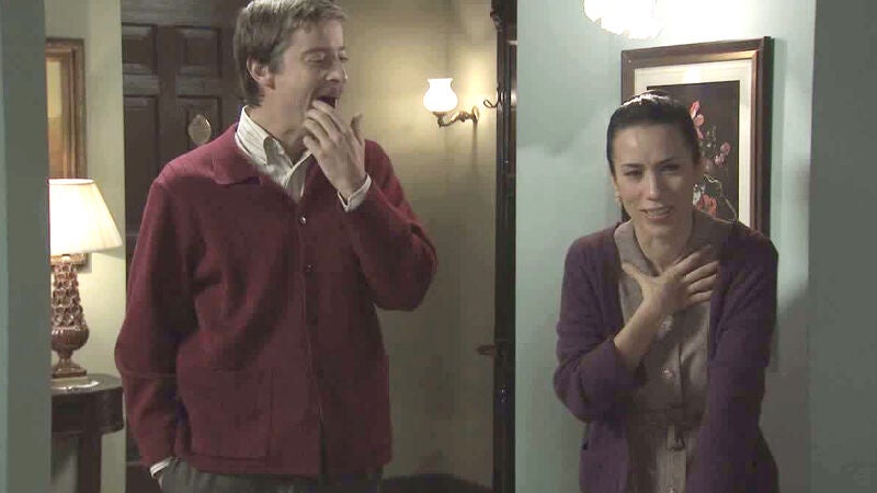 Un golpe de tos es incontroloble y más aún viniendo acompañado de risas. Esto le sucede a Manolita durante el rodaje de una escena de 'Amar'. Mientras Marcelino habla y explica sus planes 'importantes', ella intenta controlarse pero no puede. Esto provoca la risa de todos.