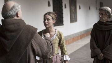 Fray Juan lleva al padre de Clara hasta el palacio de Castamar para poder esconder al hombre de los guardias que le buscan por el presunto asesinato de un general.