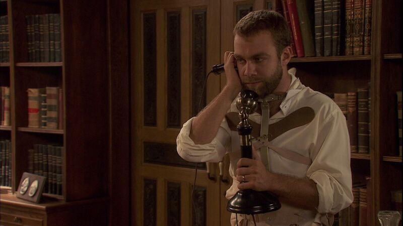 Hipólito se prueba el uniforme de policía y Pedro, siguiendo la moda de la policía montada de Canadá, le hace entrega de un asno como montura.
