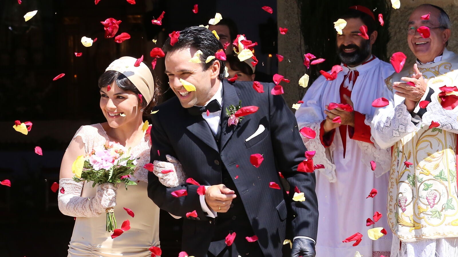 Los invitados salen de la iglesia donde se ofició el matrimonio entre Mencía y Carmelo para darles el recibimiento como marido y mujer. Con pétalos de rosa, la pareja fue bañada con alegría antes de recibir la enhorabuena por parte de sus seres queridos.