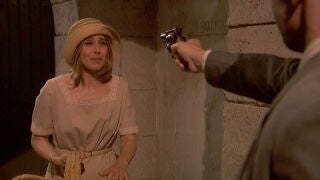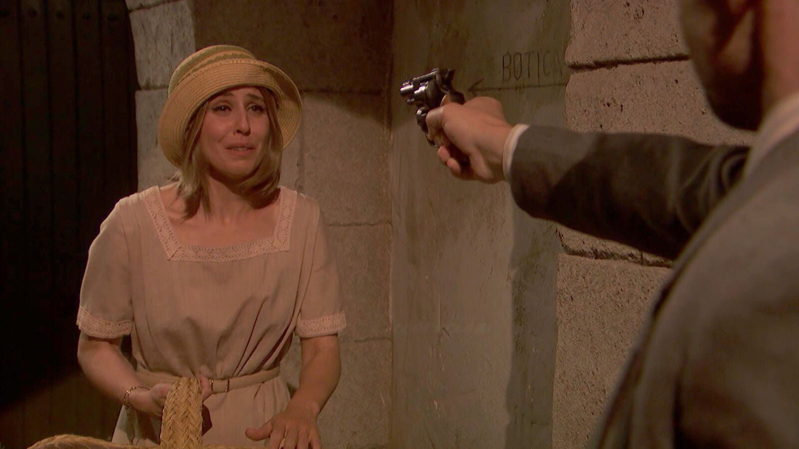 El hombre que estaba amenazando a Adela es el mismo que aparece en la plaza a la vuelta de su paseo. Aprovecha la oportunidad de que no hay nadie para pegarle un tiro a Adela. Por suerte, el el agresor no tiene tiempo de rematarla porque aparece Melitón para espantarle.