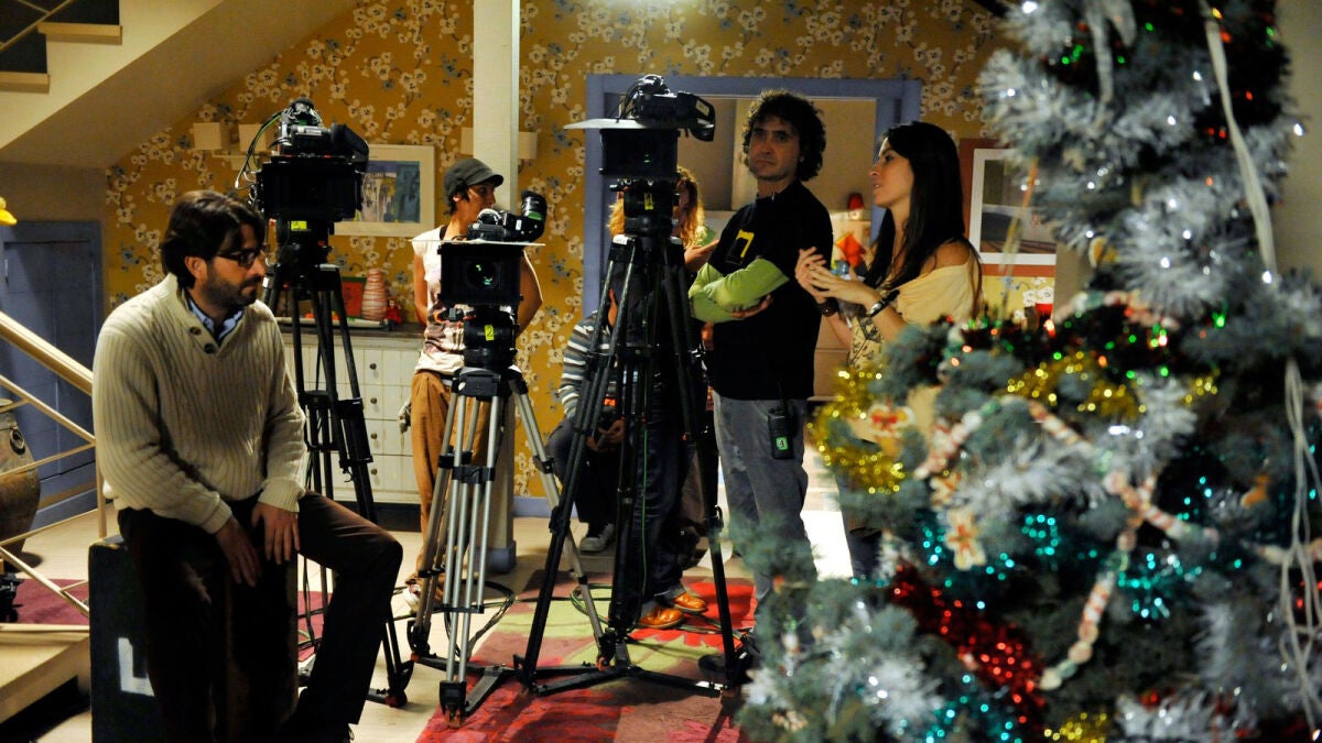 Es divertido estar representando la Navidad en pleno mes de Octubre. El ambiente navideño inunda cada rincón del plató. Adornos, luces navideñas, árbol… Todo hace que en el plató número 2 sea Navidad… aunque estemos en manga corta.