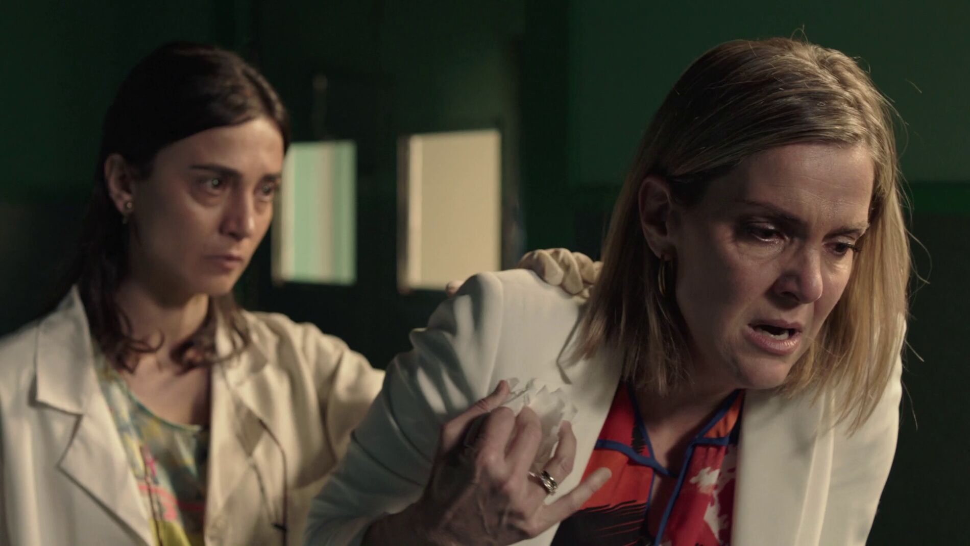 En el primer capítulo de 'Mar de plástico' pudimos ver una parte de la reacción de Carmen, la alcaldesa, después de reconocer la cabeza de su hija mayor, Ainhoa. Sin embargo, no habíamos visto esta secuencia exclusiva en la que se muestra la reacción al completo. A pesar de la fortaleza de Carmen, ésta se desploma durante unos segundos al reconocerla, para ocultarse después otra vez tras su coraza.