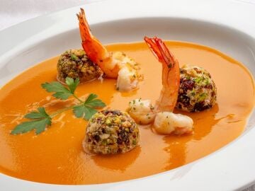 Para 4 personas ¡No le falta un detalle! Receta de crema de langostinos y bolas de queso con frutos secos, de Joseba Arguiñano