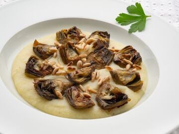 Para 4 personas Receta fácil y de temporada, de Karlos Arguiñano: alcachofas con puré de patatas avainillado y piñones