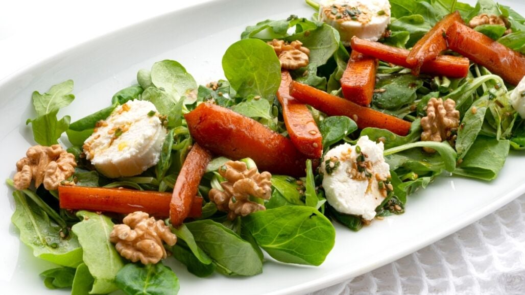 El chef Karlos Arguiñano presenta una ensalada de queso de cabra y zanahoria con un toque innovador: la zanahoria glaseada, que aporta un sabor único y sorprendente.